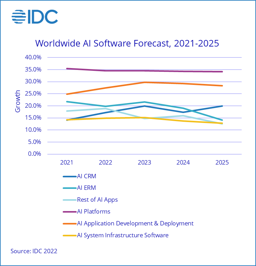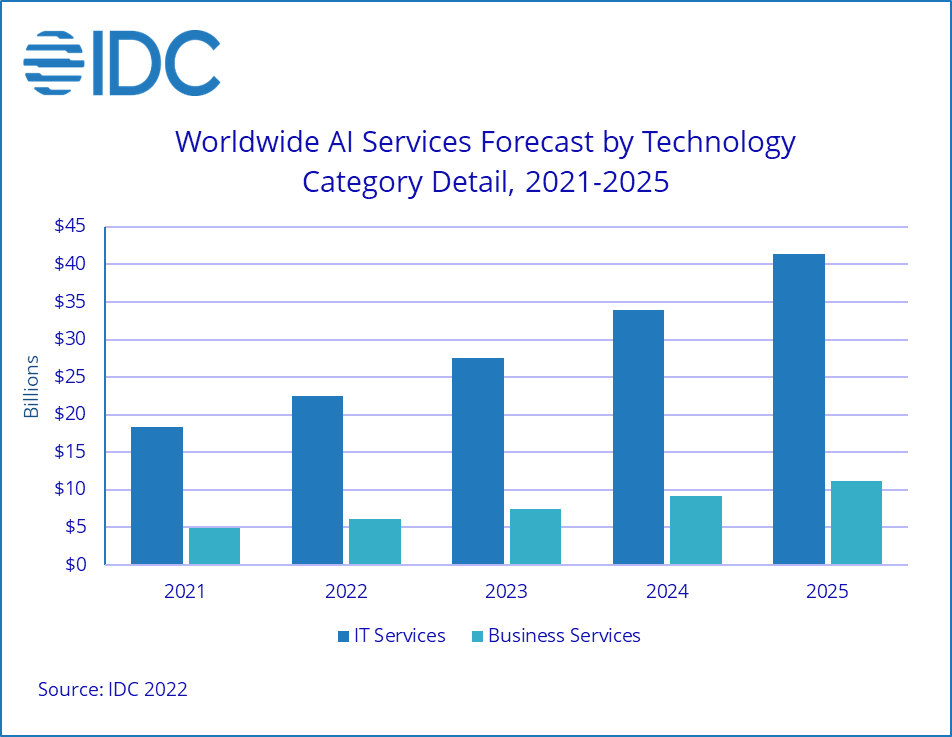 在这三个技术类别中,人工智能硬件和服务支出增长更快,人工智能软件支出份额将在2022年略有下降。这一趋势将持续到2023年。总体而言,人工智能服务预计将在未来五年内实现最快的支出增长,复合年增长率(CAGR)为22%,而人工智能硬件复合年增长率为20.5%。